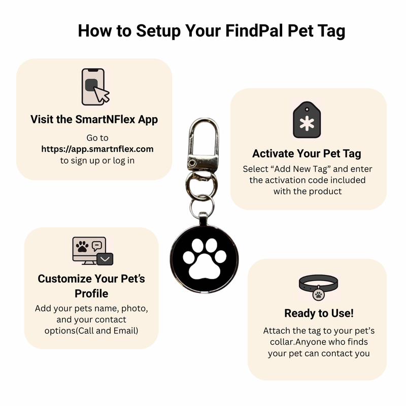 Getting started is simple — tap your FindPal tag with your phone, register online, and add your pet’s details. You’ll be ready to use it in minutes — no app or battery needed.