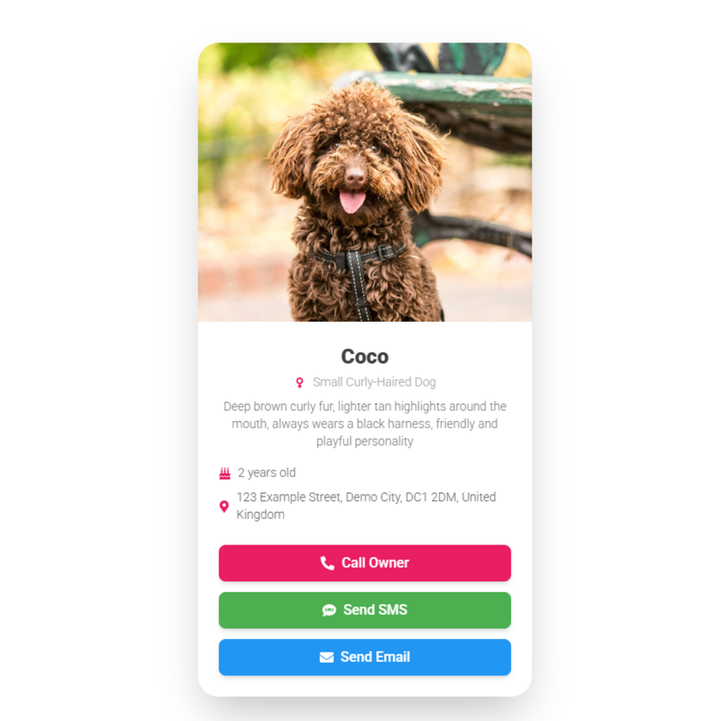 It shows your pet’s name, photo, and your chosen contact options.