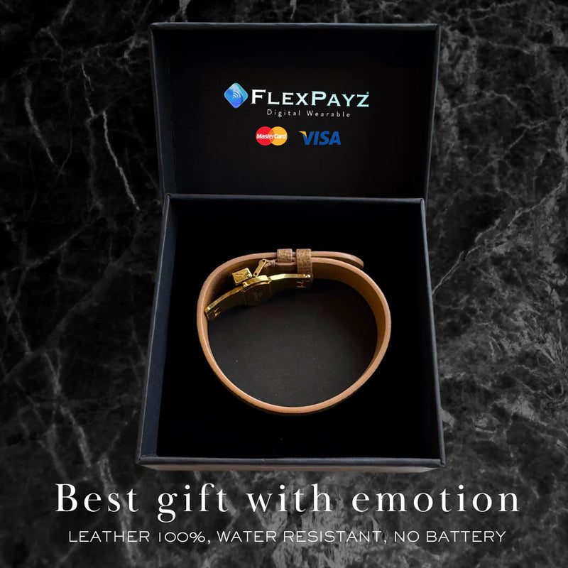 The FlexPayz Leather Halo Bracelet in gold blends luxury with innovation. Its soft leather band and elegant gold finish make it both stylish and practical. Powered by FlexPayz, it’s waterproof, requires no charging, and works anywhere contactless payments are accepted — secure, seamless, and built for modern living.