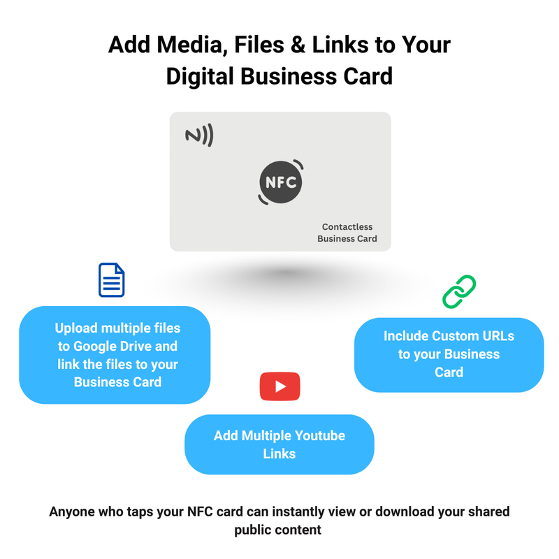 Simply tap your card against any NFC-enabled smartphone to share your digital profile instantly — including your contact info, links, and files. No app is needed.